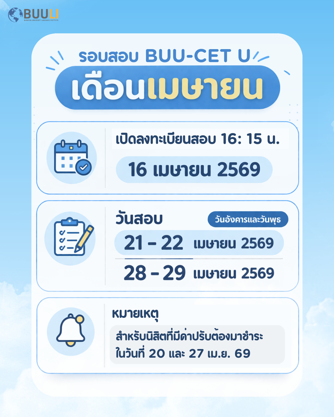 ประกาศ การทดสอบความรู้ภาษาอังกฤษ BUU GET ครั้งที่ 5/2568 วันที่ 19 กรกฎาคม พ.ศ. 2568