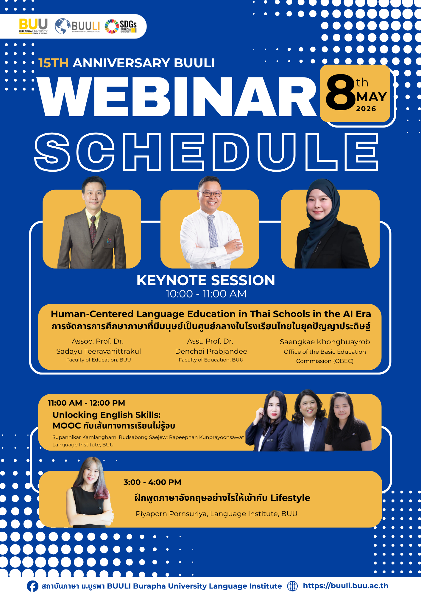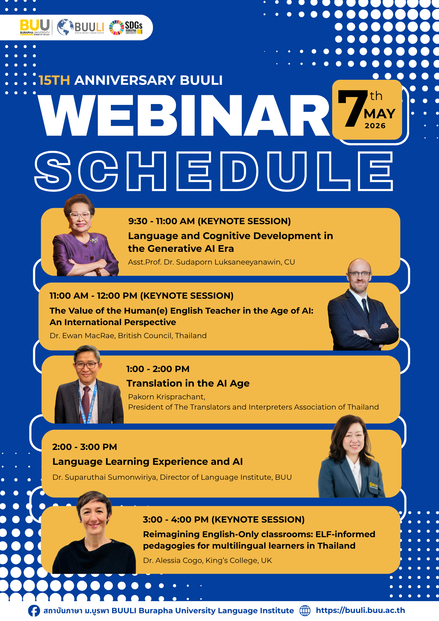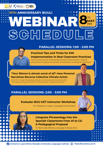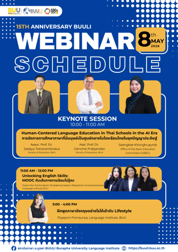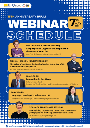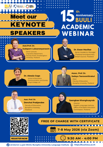 สถาบันภาษา มหาวิทยาลัยบูรพา (BUULI) ขอเชิญครูผู้สอนภาษาอังกฤษ อาจารย์ นักวิชาการ นิสิต นักศึกษา และผู้ที่สนใจด้านภาษาและการศึกษา เข้าร่วมงาน เสวนาวิชาการเนื่องในโอกาสครบรอบ 15 ปี วันสถาปนาสถาบันภาษา มหาวิทยาลัยบูรพา (15th Anniversary BUULI Academic Webinar) พบกับ Keynote Speakers ผู้เชี่ยวชาญทางด้านการสอนภาษาทั้งชาวไทย และชาวต่างประเทศ