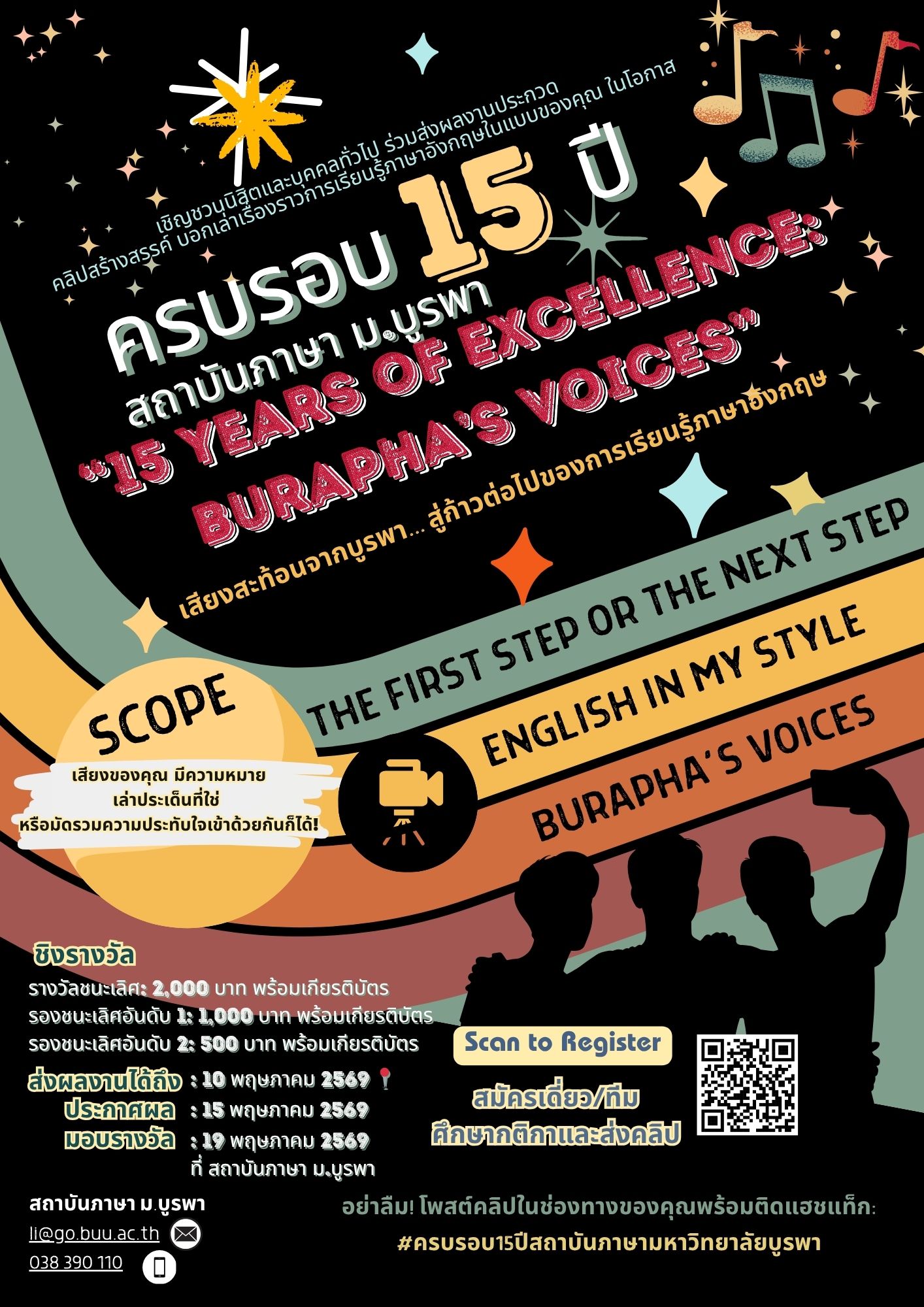 สถาบันภาษา ม.บูรพา ชวนร่วมส่ง "เสียง" แห่งการเรียนรู้ภาษาอังกฤษ ในโอกาสครบรอบ 15 ปี! กับโครงการ "15 Years of Excellence: Burapha’s Voices"